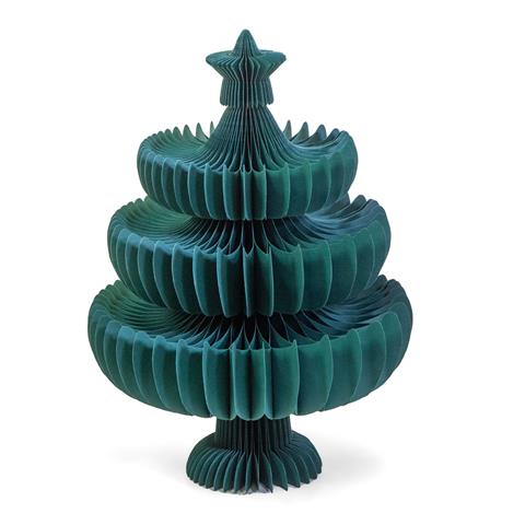 ALBERO NATALE realizzato in carta a nido d'ape, una raffinata CARTA A NIDO D'APE che permette di ottenere una struttura tridimensionale leggera, resistente e dall'aspetto scenico. Il modello, con dimensioni D72 e H100 cm, si presenta in una tonalitĂ verde intensa, ideale per chi desidera un allestimento natalizio contemporaneo e originale. L'allestimento richiama la forma di un albero di Natale tradizionale ma con un tocco decorativo moderno dato dalle sezioni sovrapposte a nido d'ape, facilmente montaribile senza attrezzi.