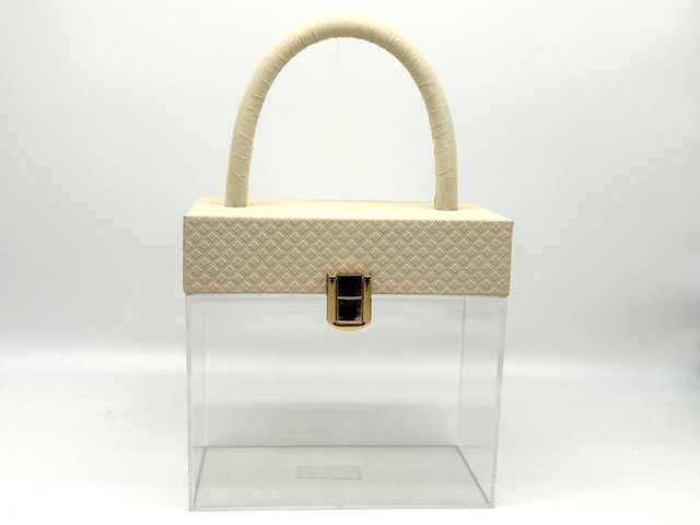 Scopri la borsa plexi trasparente con manico in ecopelle crema, stile elegante per bouquet e regali floreali.