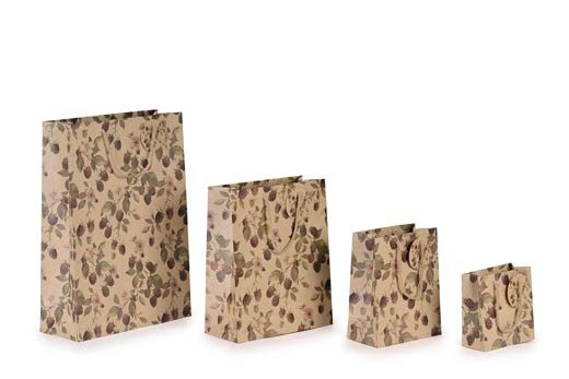 Borsa shopper in carta avana con motivo berries, 26x12x32 cm. Stampa elegante, ideale per bouquet e idee regalo, resistente e riciclabile.