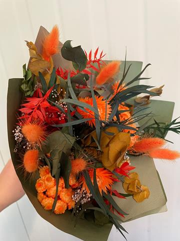 Bouquet di fiori essiccati e stabilizzati in tonalità Primavera arancione, D20cm H35cm. Elegante confezione per ogni ambiente.