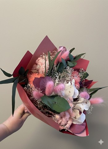 Care tips: per prolungare la bellezza del bouquet di fiori essiccati e stabilizzati, spruzza leggermente con un apposito spray conservante o asciuga la stanza da polvere con una piuma. Evita contatti prolungati con fonti di calore e umidità per preservare la tonalità rosa e la texture soffice dei materiali.