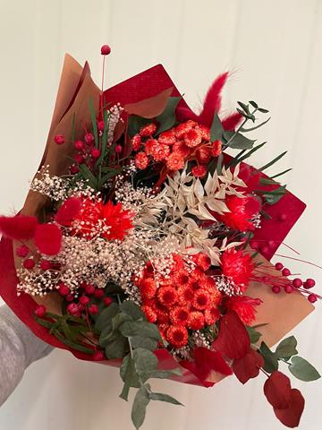 Bouquet di fiori essiccati e stabilizzati in rosso primaverile, D20cm x H35cm, stile elegante e duraturo.