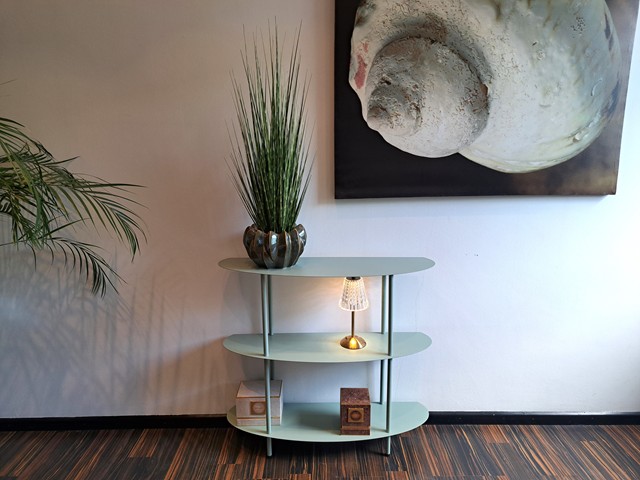 Realizzata in metallo con una finitura verde salvia, questa console in metallo presenta 3 ripiani robusti che permettono di organizzare piante, fiori recisi e accessori per la casa. L'inconfondibile tonalità verde salvia richiama la natura e si integra facilmente con ambienti moderni, classici o minimal chic.