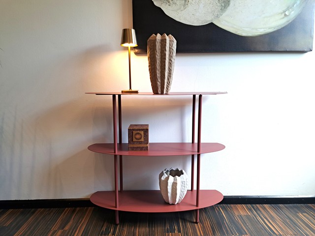 Consolle metallica tre ripiani rubino 90x28x81 cm, ideale per vasi e decorazioni floreali e per creare composizioni preziose.