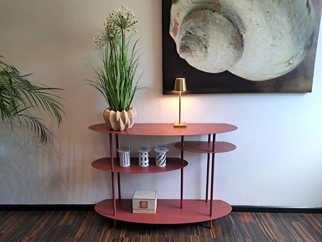 Consolle in metallo rubino a 4 ripiani, ideale per fiori, piante e decorazioni. Design robusto e versatile.