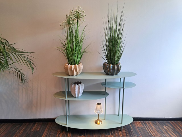 Questo supporto in metallo è perfetto per creare angoli verdi o per un ingresso accogliente. Puoi utilizzare contenitori o box decorativi sui ripiani, oppure disporre scatole contenenti accessori da giardino per un effetto ordinato e di design. L’estetica metallo verniciato nella tonalità verde salvia offre una base neutra ma di grande PERSONALITÀ, facile da abbinare a vasi in ceramica, terracotta o porcellana.