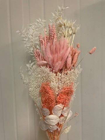 Mazzo verticale essiccato 65/70cm in delicate tonalità bianco e rosa, pensato per chi cerca eleganza senza manutenzione. Questo bouquet verticale o mazzo decorativo è realizzato con fiori essiccati di alta qualità che mantengono la loro forma e colore nel tempo. La presentazione slancia l’ambiente e aggiunge un tocco romantico a living, ingresso o studio.