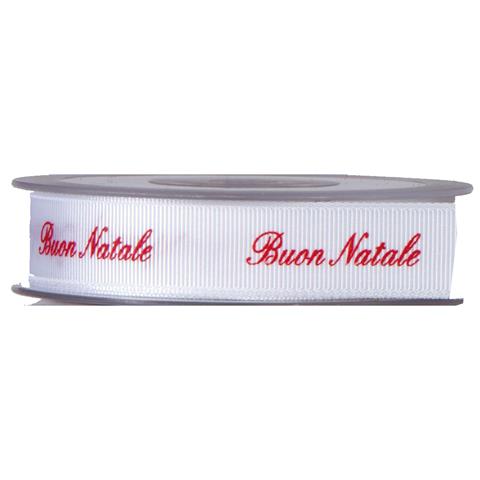 Nastro gros grain Bianco/Rosso 1,5 cm x 20 m con testo Buon Natale, ideale per decorazioni floreali e confezioni regalo.