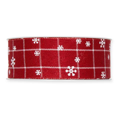 Nastro Little Snow Stars in versione rossi/bianco, con una larghezza di 3,5 cm e una lunghezza di 18 metri, perfetto per impreziosire bouquet, vasi e confezioni regalo. Il design a quadretti rossi e bianchi con stelle in stile invernale aggiunge un tocco elegante e festivo a ogni progetto.