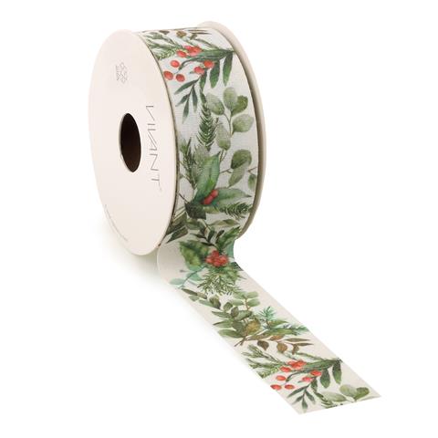 Nastro decorativo avorio/verde con motivo agrifoglio, perfetto per confezioni natalizie e decorazioni floreali.10 m, tessuto resistente.