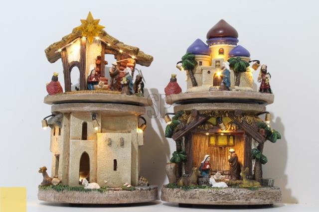 Natività luminosa con musica, movimento e batteria. Modelli assortiti, altezza 23 cm. Perfetta per originali decorazioni natalizie.