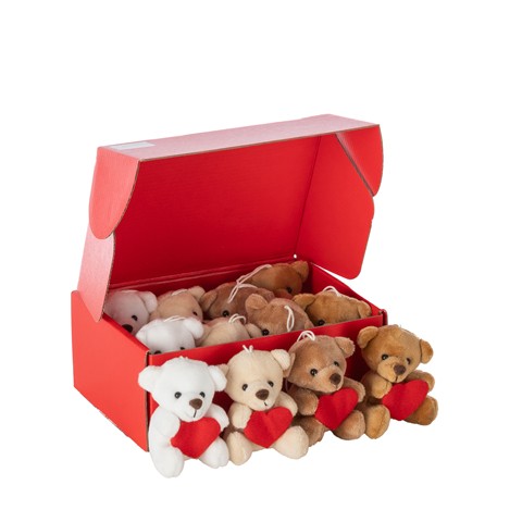 Orsetti peluche con cuore, box 12 pezzi, colori assortiti. Regalo romantico e dolce, ideale per bouquet e decorazioni.