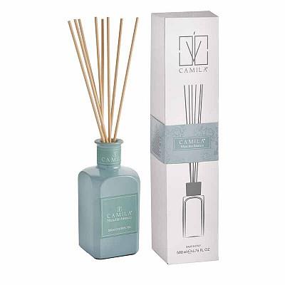Profumatore d'ambiente Camila Elegance con bastoncini, 500 ml, Muschio Bianco in azzurro. Contenitore elegante e confezione in carta zuccher